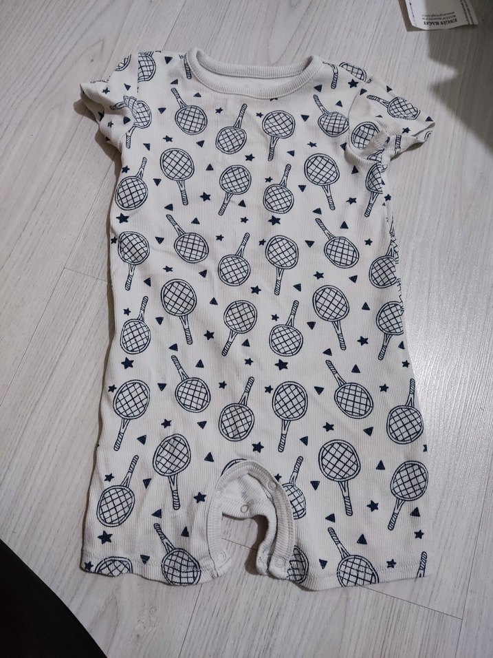 Pamuk kumaştan, gri baskılı, kısa kollu ve düğmeli bebek tulumu. Yuvarlak yaka ve rahat kesimle tasarlanmıştır.
