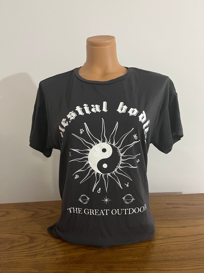 Satenimsi kumaştan, gevşek kesim, bisiklet yaka ve kısa kollu defacto tişörtü. Siyah-gri baskılı gotik desenli, yin-yang güneş motifi ve "The Great Outdoor" yazısı içerir.