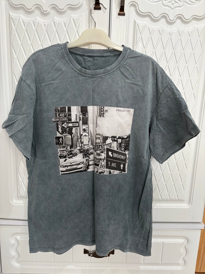 Gri renkte, baskılı şehir temalı desenli, kısa kollu, bol kesim denim tişört. Yuvarlak yaka ve kısa boy ile sokak tarzına uygun.