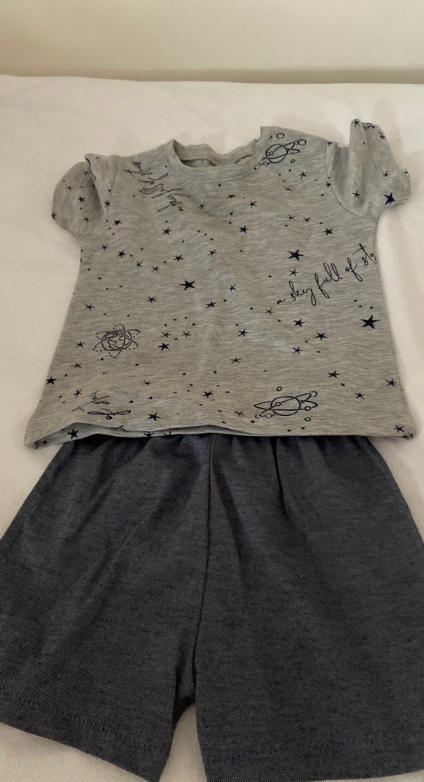 Gri baskılı kısa kollu, yuvarlak yakalı örme üst ve uyumlu gri pantolondan oluşan erkek bebek takımı. Rahat tekstil kumaşı ve sokak stili için uygun. ⭐