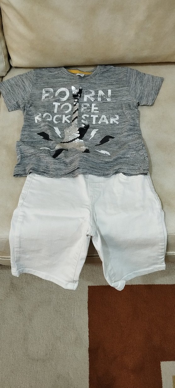 Pamuklu gri kısa kollu tişörtü 'Born to be Rockstar' baskılı, beyaz şort ile kombinlenmiş rahat erkek bebek takımı.