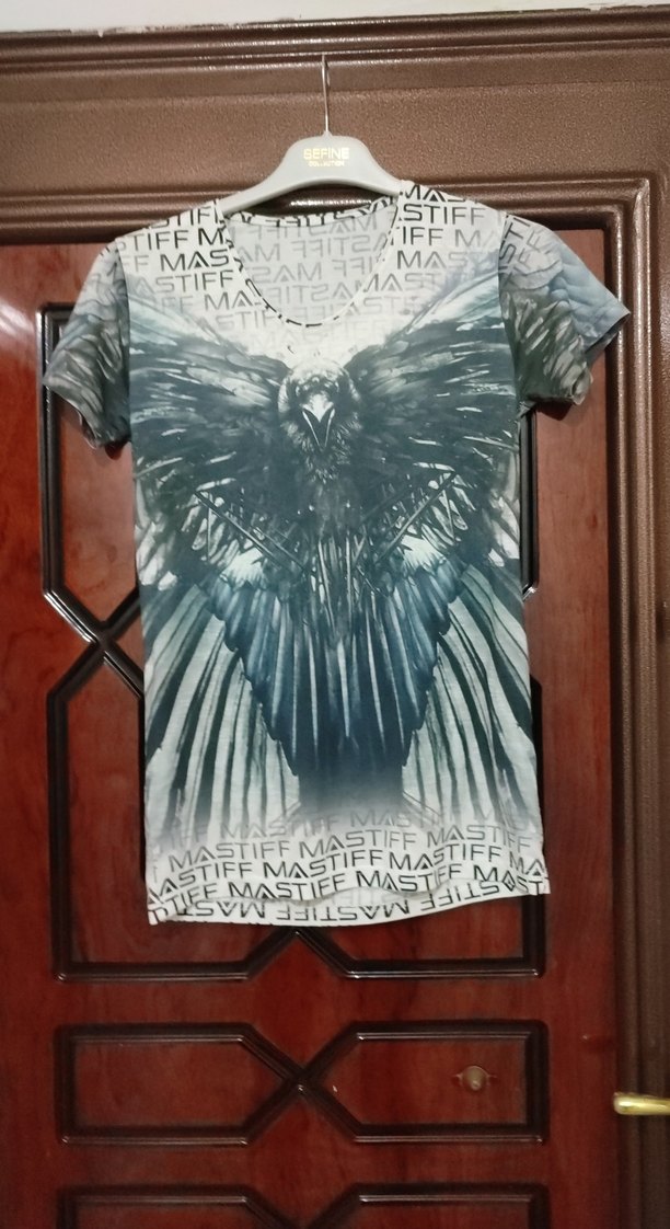 Gri renkte, baskılı gotik karga desenli, kısa kollu ve bisiklet yaka, sentetik kumaştan yapılmış, rock punk tarzı uyumlu, vücuda oturan erkek tişörtü.