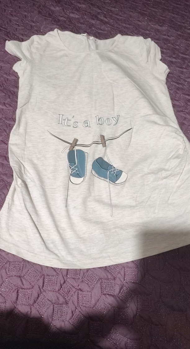 Gri pamuklu kumaştan, düğmeli ve baskılı "It's a boy" yazılı, kısa kollu, bol kesim hamile bluzu.