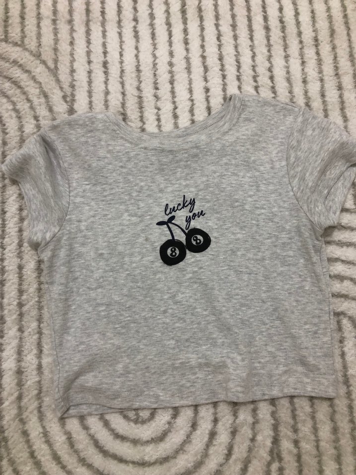 Pamuklu örgü kumaştan, gri renkli, kısa kollu, baskılı, bol kesim ve kısa boyda, bisiklet yaka kadın tişörtü.