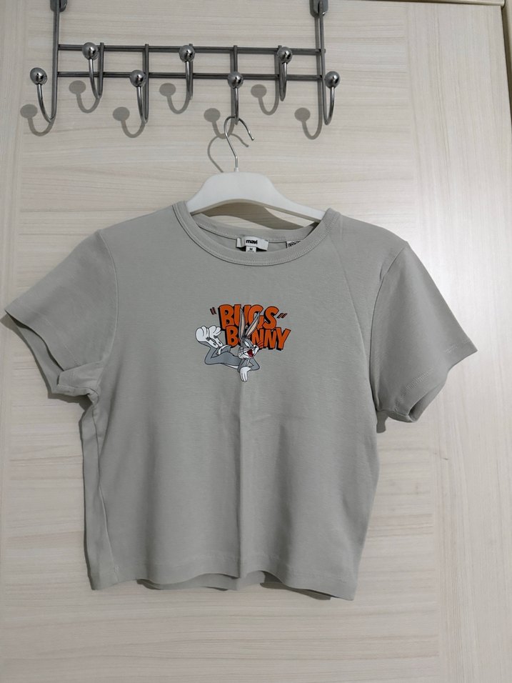 Gri renkli, pamuklu, kısa kollu, yuvarlak yaka, Bugs Bunny baskılı bol kesim tişört. Rahat ve günlük stil için uygundur. 1 kere giyilmiştir .