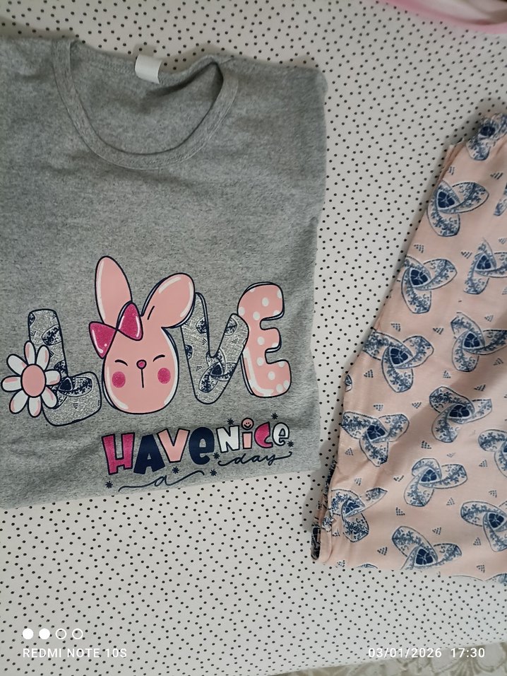 Gri baskılı kısa kollu, yuvarlak yakalı, kız çocuk pijama takımı. uzun alt pijamadan oluşuyor ve rahat bir modeldir. pamuklu kumaş
