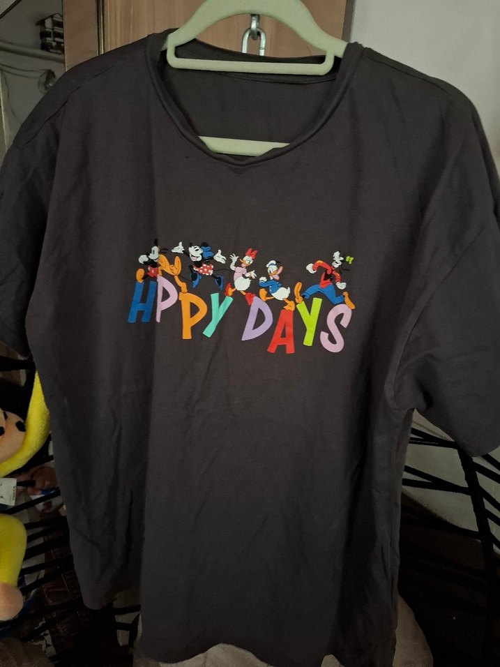 Gri renkli, kısa kollu ve salaş kesim tişört, önünde renkli "APPY DAYS" baskısı ve çizgi film karakterleri bulunur.