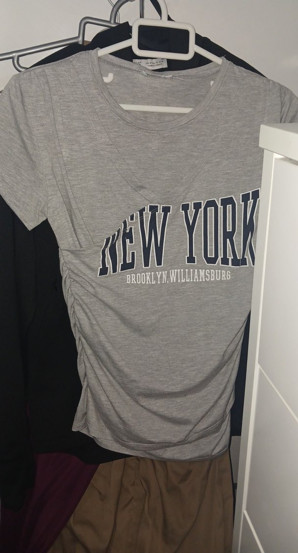 Gri renkli, kısa kollu, bisiklet yaka tişörtü. Ön kısmında 'NEW YORK' baskısı ve drapeli, vücuda oturan kesimi bulunur. hic giyilmedi ️