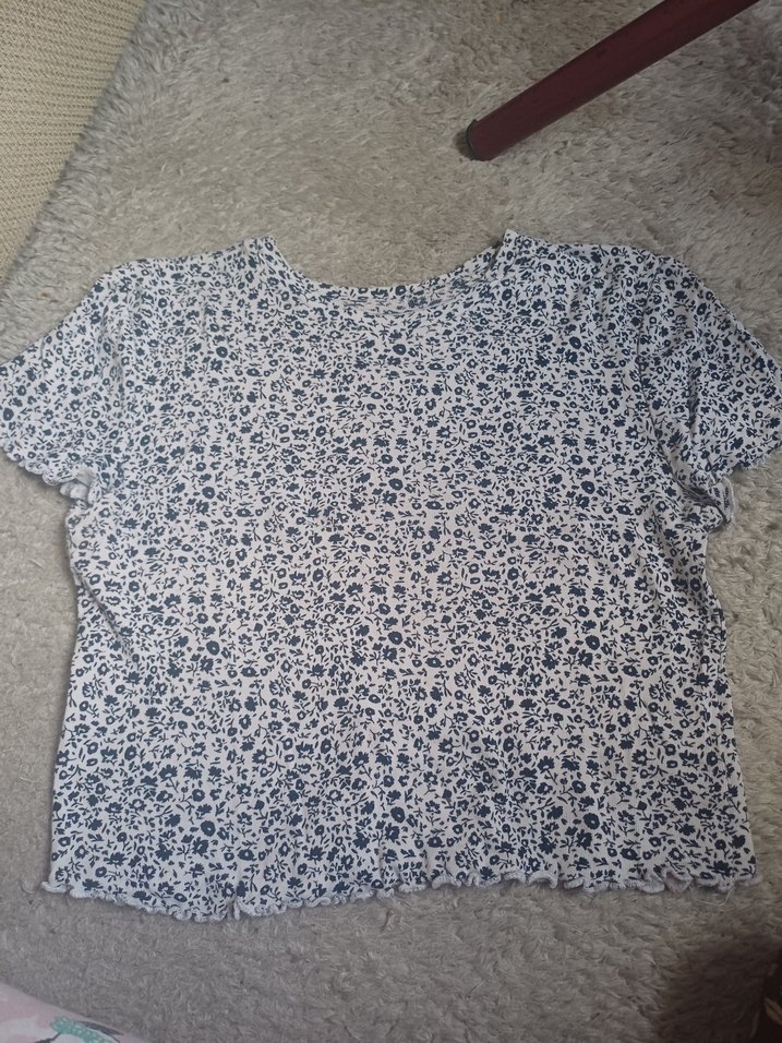 Pamuklu kumaştan, baskılı desenli, kısa kollu ve yuvarlak yaka tişörtü. Rahat ve bol kesimiyle günlük kullanıma uygundur. kısadır. crop gibi, lacivert çiçekler. kollar japone kol fırfırlı alt kısmıda oyle.