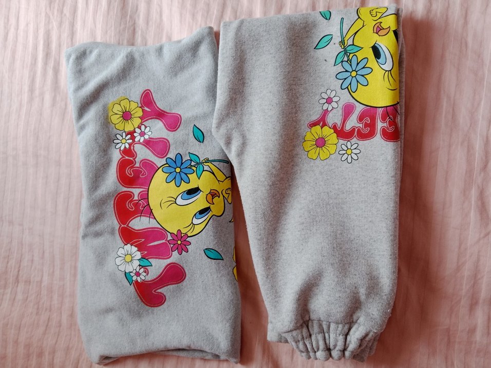 Gri renkli, uzun kollu ve yuvarlak yakalı kız çocuk eşofman takımı, baskılı desenler ve örme detaylar içerir. Rahat kesimlidir ve sokak stiline uygundur.
