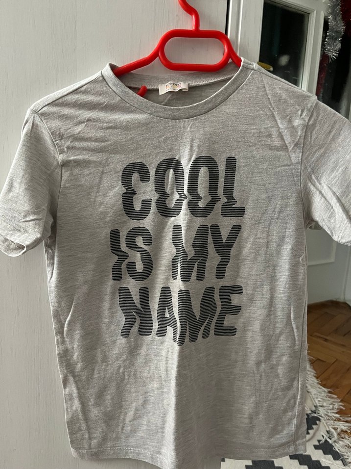 Pamuk kumaştan, gri renkli, baskılı ve normal kesim kız çocuk kısa kollu tişört. Üzerinde 'COOL IS MY NAME' yazısı bulunur.