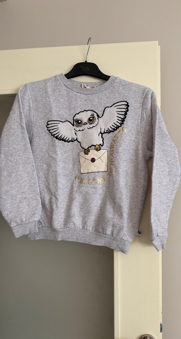 Gri, yuvarlak yaka ve uzun kollu bu sweatshirt, örgü dokusu ve bol kesimiyle rahat kullanım sunar. Üzerinde zarf tutan baykuş baskısı vardır.
