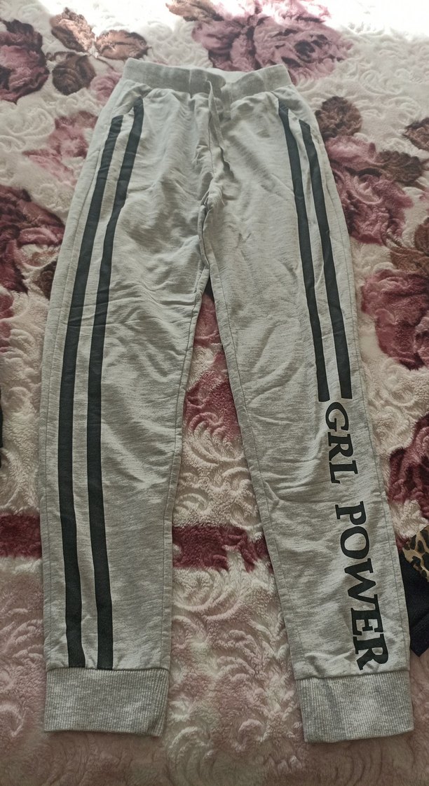 Pamuklu kumaştan, bol kesim gri sweatpant. Siyah çizgiler ve 'GRL POWER' baskısı bulunur. Fermuarlı cepler mevcuttur.