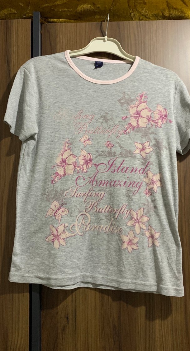 Gri renkte, pamuklu, kısa kollu, yuvarlak yaka ve bol kesim kız tişörtü. Bohem tarzda çiçek ve kelebek baskılı, "Istand" yazılı.