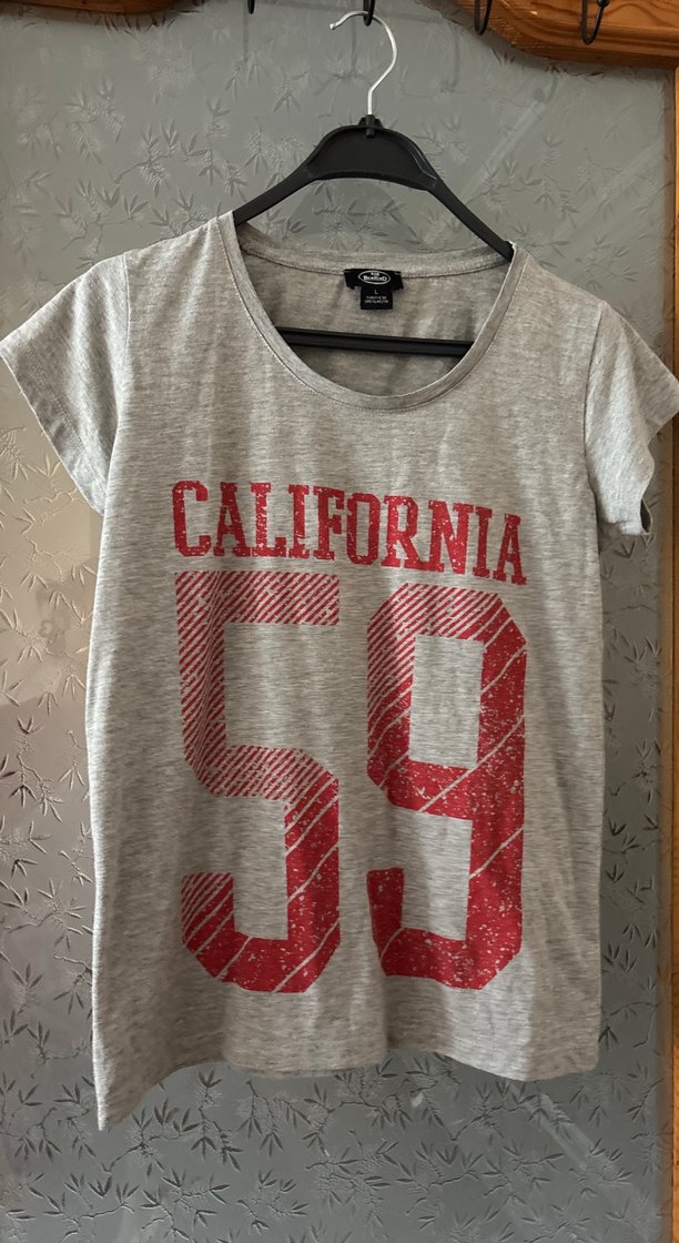 Gri renkli kız tişörtü, pamuklu kumaştan, kısa kollu ve salaş kesimlidir. Önünde kırmızı "CALIFORNIA 59" baskısı vardır.