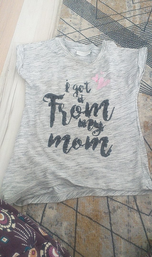 Gri renkli kız tişörtü, pamuklu kumaştan, kısa kollu ve rahat kesime sahiptir. Üzerinde 'just it from my mom' yazılı baskı ve küçük pembe taç detayı bulunur. 3-4 yaş
