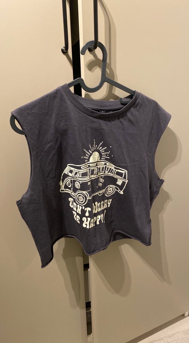 Kolsuz, gri, bol kesim hamile tişörtü, baskılı vintage minibüs ve 'Don't Worry Be Happy' yazısıyla. Kısa boyu ve tokalı detaylarıyla rahat ve rock punk havasında.