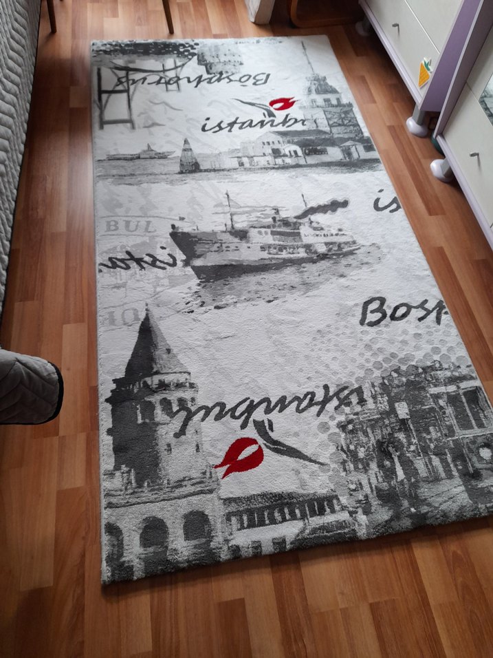 Gri renkli, İstanbul temalı baskılı konvansiyonel halı, yumuşak dokusu ile yaşam alanlarına uygundur. ️