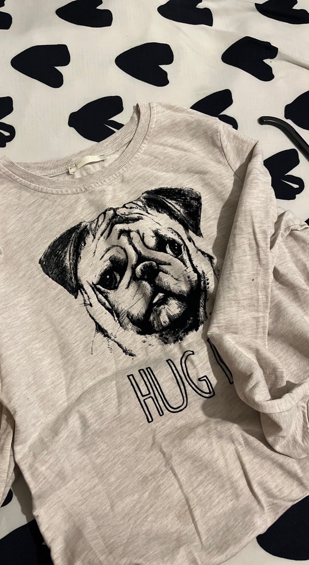 Gri renkli, baskılı pug yüzü ve kürk detaylı köpek kıyafeti. Sokak tarzında rahat ve şık tasarım.