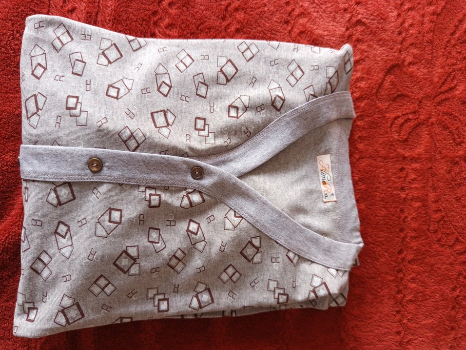 Gri renkli, baskılı desenli, V yakalı, uzun kollu ve midi boyda bol kesim lohusa ve emzirme pijama takımı. 2 adet baba pijaması bir tanesinin baski hatası var sıfır hiç kullanılmamış. biri L beden digeri Xl