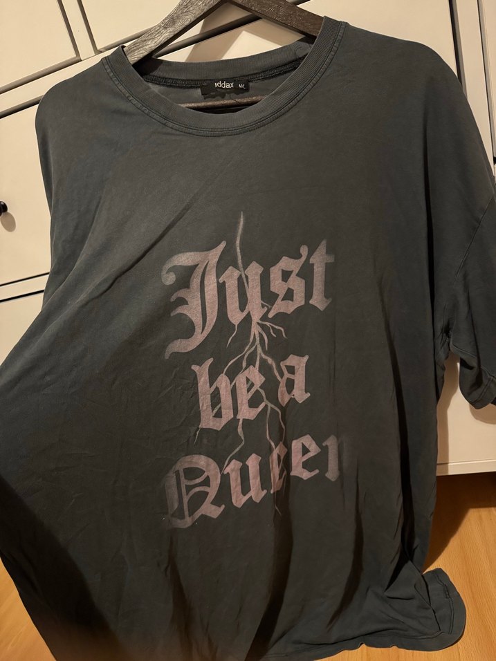Koyu gri pamuk hamile tişörtü, 'Just be a Queen' baskılı, loose fit ve kısa kollu. Gotik punk tarzıyla romantik akşamlar için uygun.