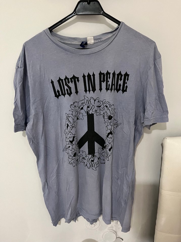 Pamuklu, gri renk, baskılı barış işareti desenli, kısa kollu ve loose fit tişörtü. Crew neck yakalı, rahat sokak stili için uygun. ✌️rengi gri mavi arası