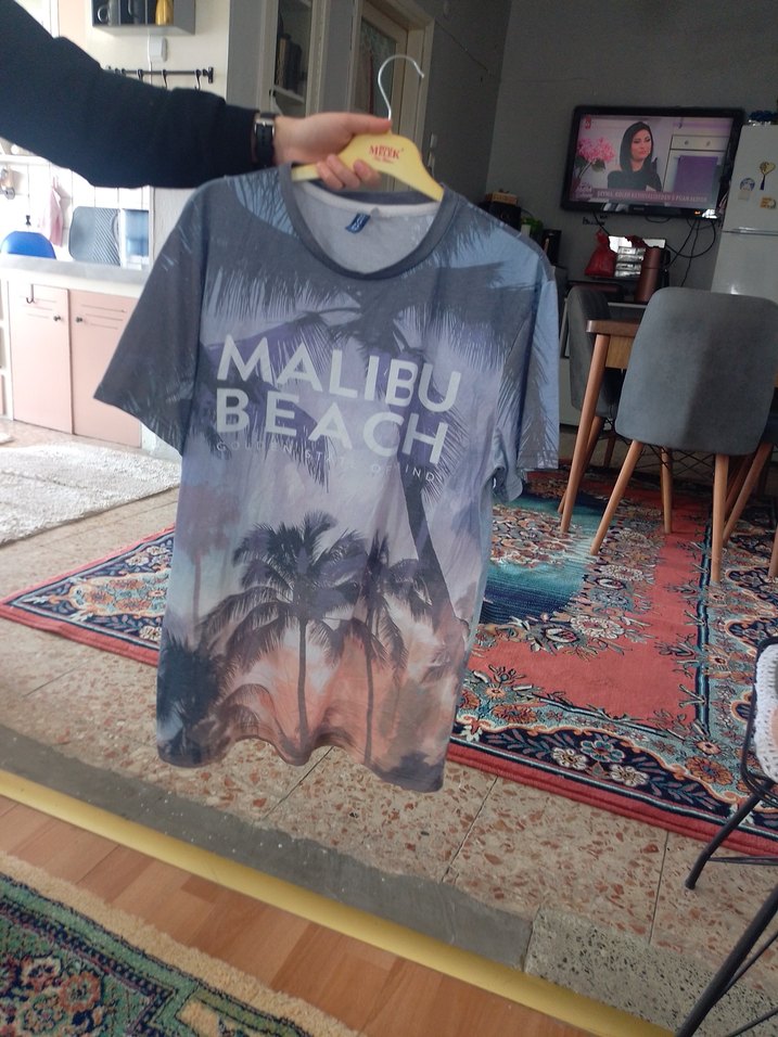 Gri renkli, baskılı Malibu Beach desenli, kısa kollu ve bol kesim erkek tişörtü. Yuvarlak yaka ve normal boyda, sokak stili için uygun.