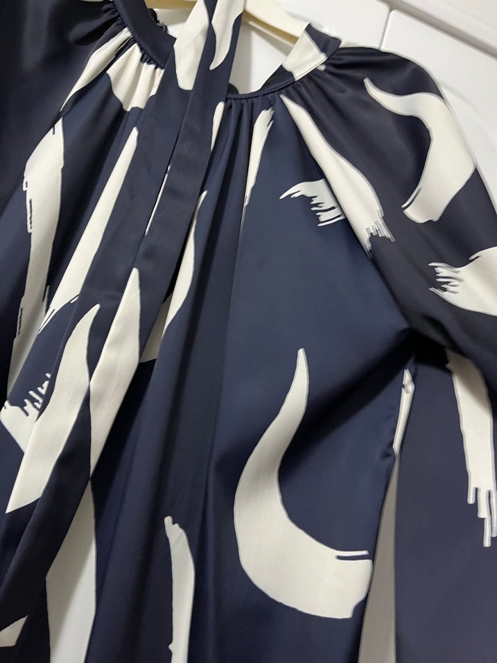 Mavi ve gri baskılı, drapeli uzun ve salaş kesim kadın elbise. Kayık yaka ve ince askılı kollara sahip, yumuşak sentetik kumaştan günlük kullanıma uygun avant-garde tarzda. Saten kumaşlı şalı ile gönderilecektir