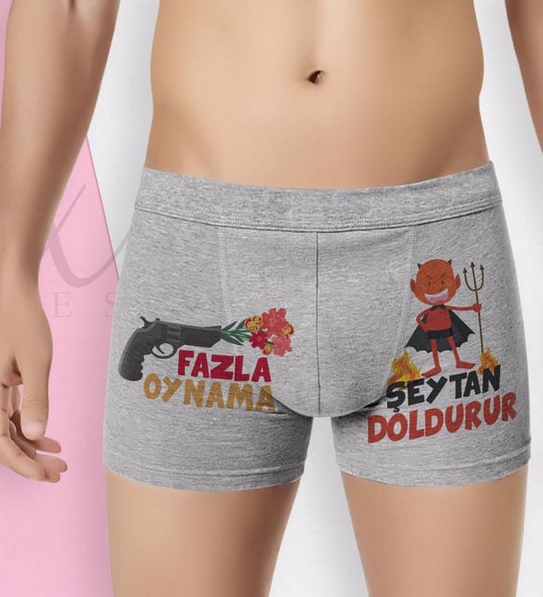 Baskılı ve kısa kesim gri erkek boxer, rahat ve vücuda oturan yapıda. Günlük kullanım için uygun.