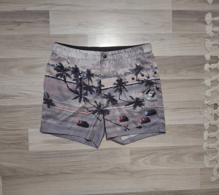 Palmiye ağaçları ve arabalar desenli, gri baskılı, sıkı kesim erkek mini deniz şortu, plajda ve sokak modasında kullanıma uygun. mağazaların teşhir ürünleridir denenmiş olabilir kullanılmamış iade yok