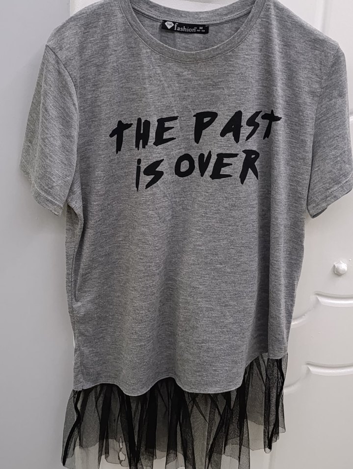 Gri renk, kısa kollu, bol kesim kadın tişörtü. Ön yüzünde baskılı yazı ve etek kısmında pileli siyah tül detay bulunur. penye kumaştan üretilmiştir. boy 66 iki kol arası 47 cm