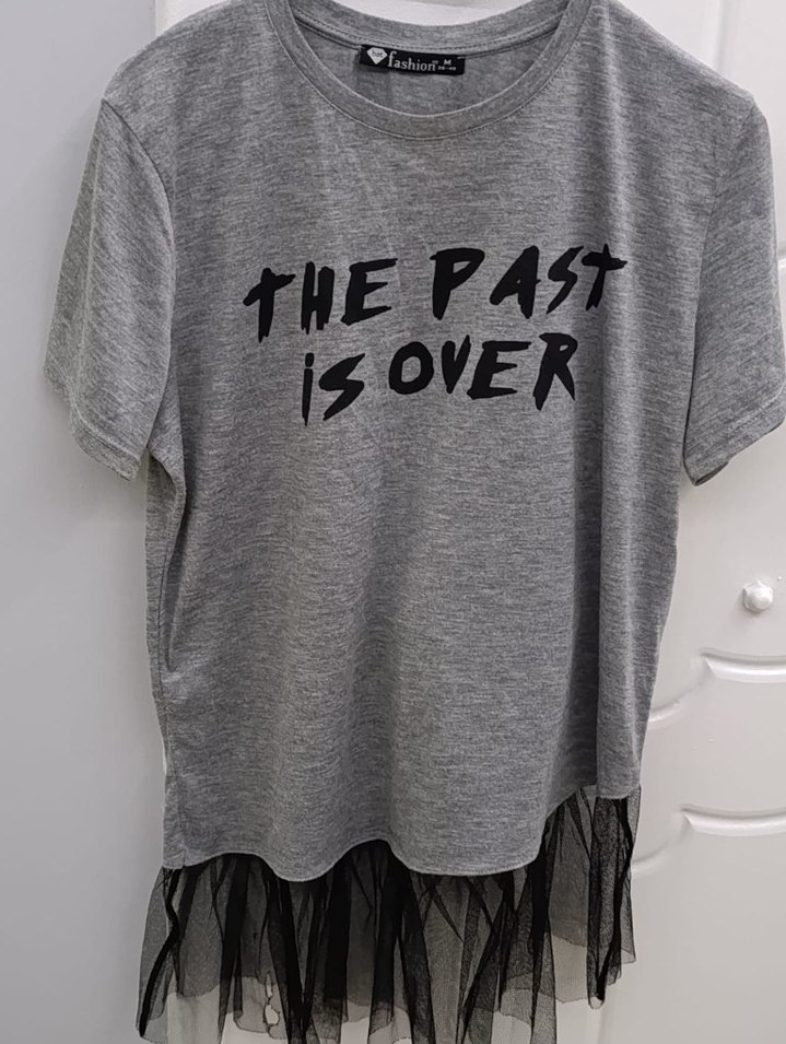 Bol kesim, kısa kollu, yuvarlak yaka kadın tişörtü. "THE PAST IS OVER" baskılı, alt kısmı tül pile detaylı, rahat keten kumaşlı.boy 66 iki kol arası 47cm yepyeni
