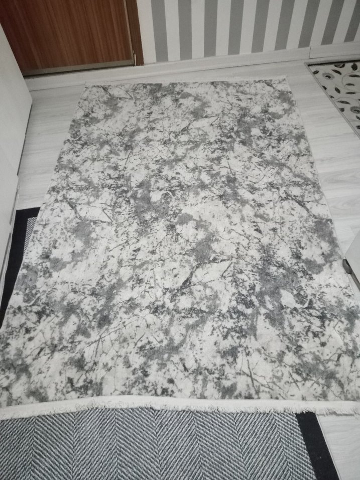 Gri baskılı desene sahip, yumuşak dokulu modern halı, odanıza zarif bir sanat dokunuşu katıyor. en 144 cm boy 222 cm