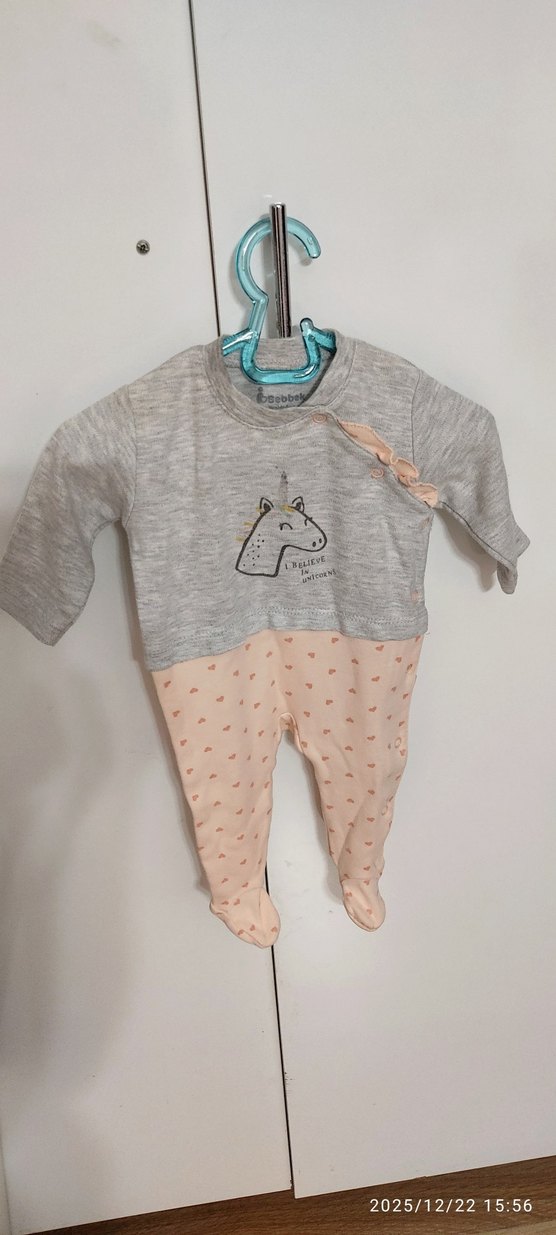 Baskılı at deseni ve örgü gri üst kısmı ile bebek kız tulumu, yumuşak şeftali renkli desenli alt kısmı ile uzun kollu ve ayaklıdır.