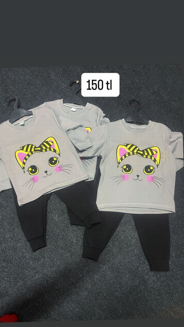 Baskılı kedi yüzü ve renkli saç bandı detaylı örgü gri kedi kıyafeti, streetwear tarzında. Fiyat: 150 TL.