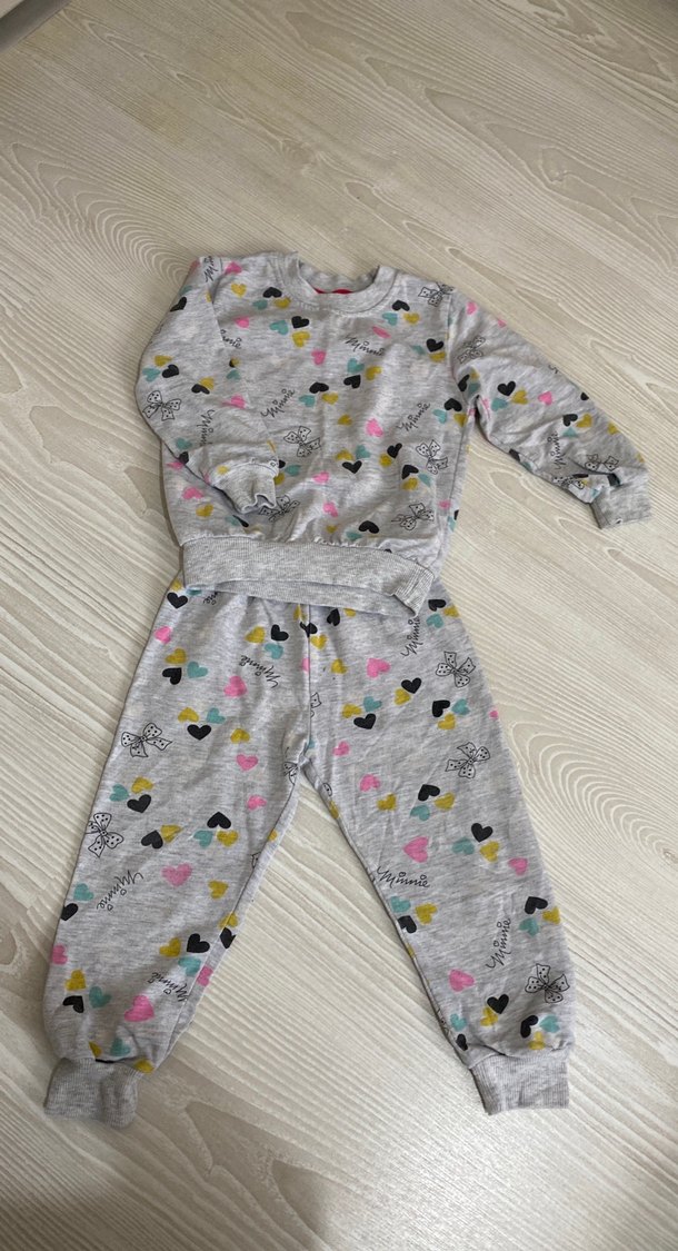 Gri örgü kumaştan yapılmış, kalp desenli baskılı ve uzun kollu bebek kız kıyafet takımıdır.