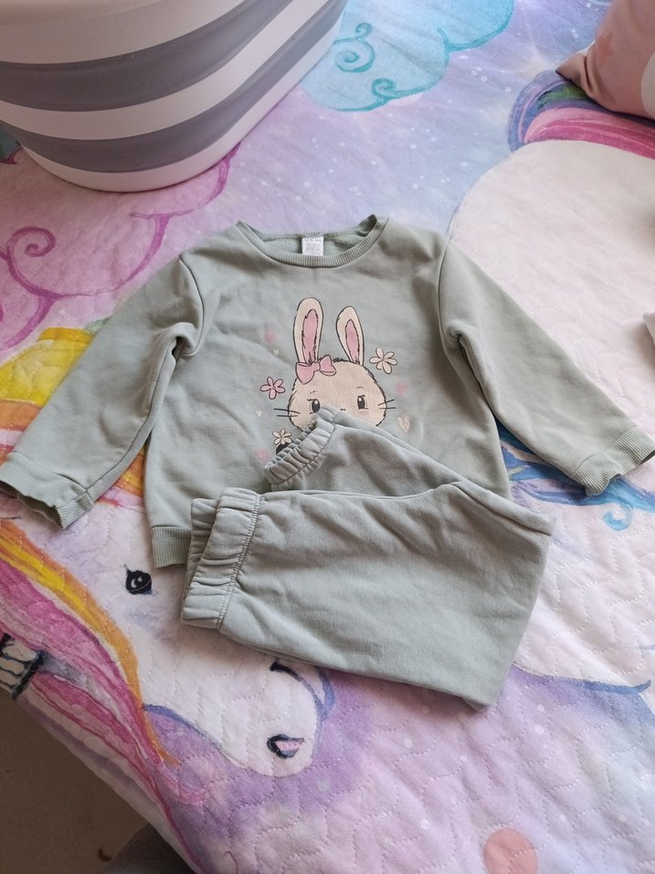 Pastel gri renkli, örme kumaştan yapılmış uzun kollu bebek kız takımı. Üstünde baskılı sevimli tavşan deseni bulunur.