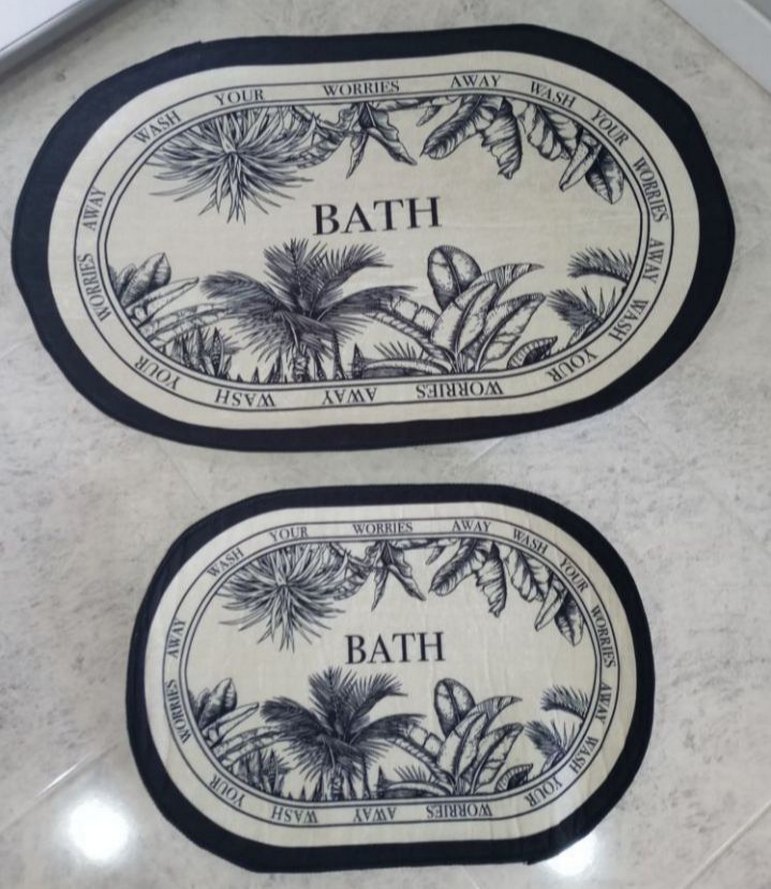 Sıfır ürün ... Orta ve küçük boyda, gri renkli, bitkisel desenli ve ortasında "BATH" yazısı bulunan oval banyo paspası seti. Dekoratif kenarlıklara sahiptir ✨