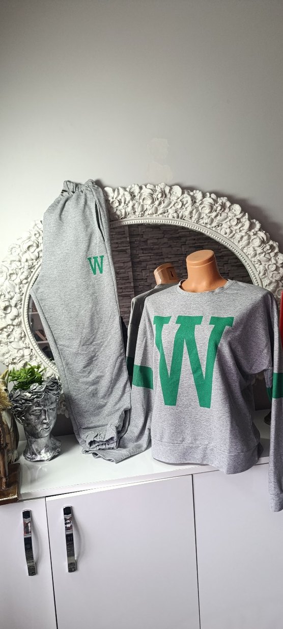 Gri pamuklu kumaştan, oversize kesimli kız eşofman takımı. Uzun kollu, bisiklet yaka ve yeşil 'W' baskılı rahat bir sokak stili sunar.