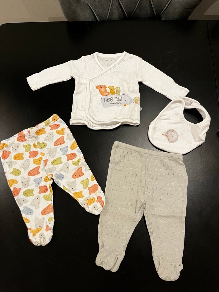Pamuk kumaştan, uzun kollu baskılı üst, iki adet ayaklı pantolon ve önlükten oluşan rahat ve şık bebek erkek kıyafet seti. 1 kere giyildi. Kız bebek giydi ama kız erkek için uygun