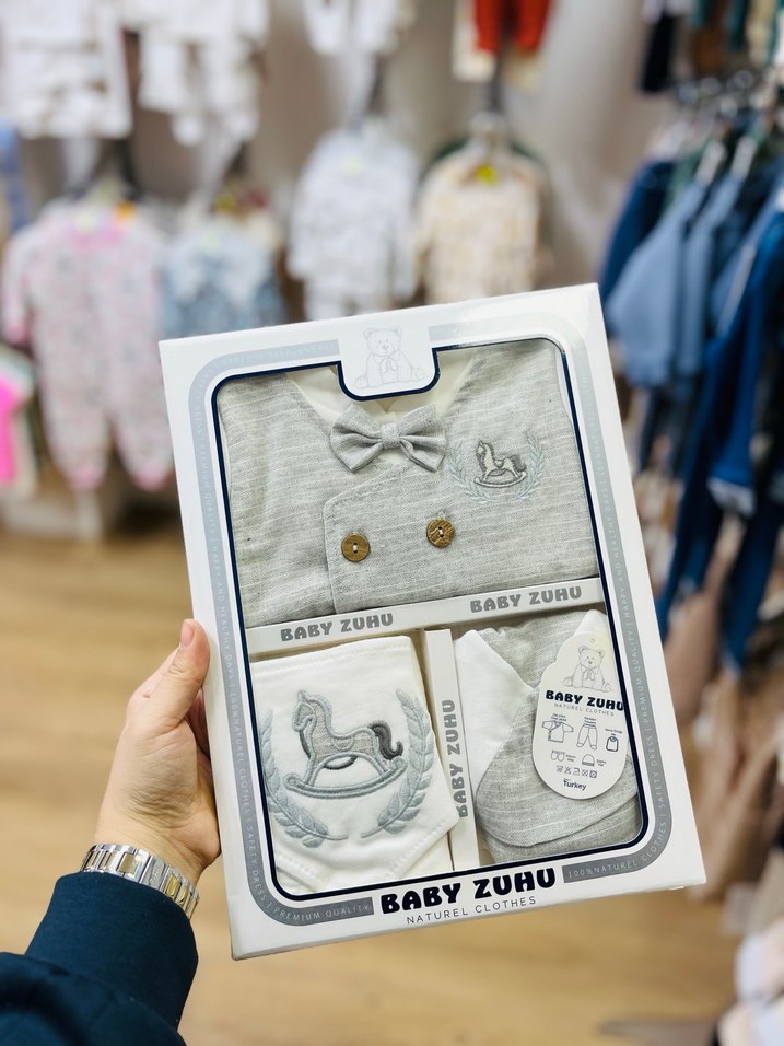 Gri baskılı, uzun kollu pamuklu bebek erkek takımı, düğmeli detaylı ve crew neck yakalıdır. Baby Zuhu markalı, uyumlu aksesuarlar içerir. 5 li set