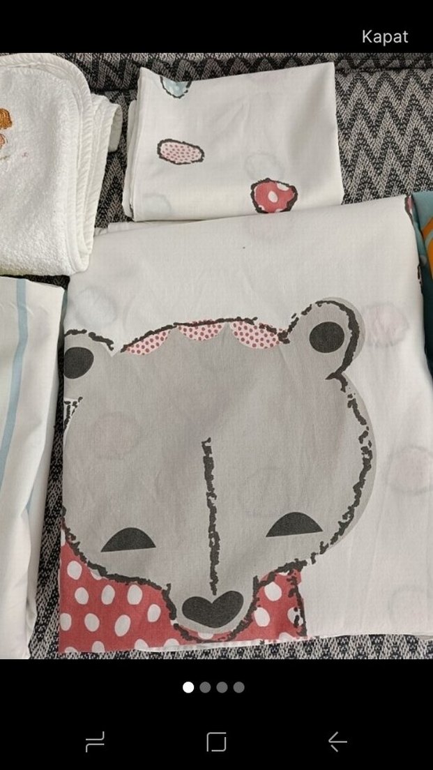 Gri pamuklu kumaştan yapılmış, üzerinde puantiyeli detaylı ayı yüzü baskısı bulunan çocuk uyku örtüsüdür. Yumuşak ve rahat bir yapıya sahiptir.