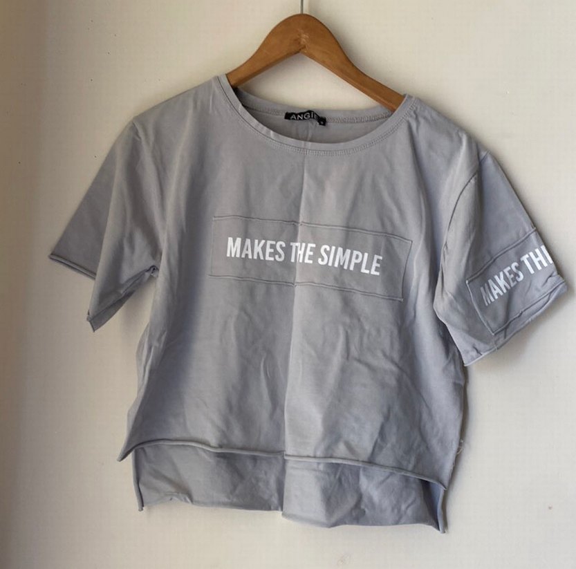 Gri, pamuklu, kısa kollu, yuvarlak yaka, baskılı sloganlı, salaş kesim tişört. Rahat ve günlük stil için hafif uzun arkası vardır.