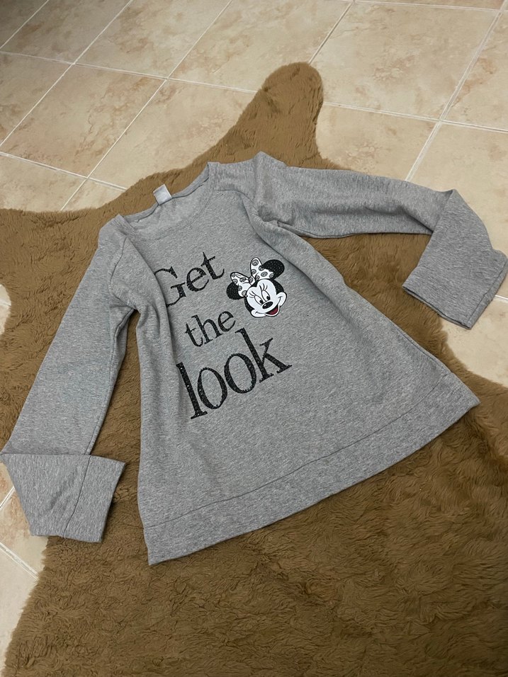 Gri renkli, uzun kollu, bisiklet yaka ve bol kesim kız çocuk sweatshirtü. Pamuklu, örme kumaştan olup "Get the look" ve Minnie Mouse baskısı vardır.