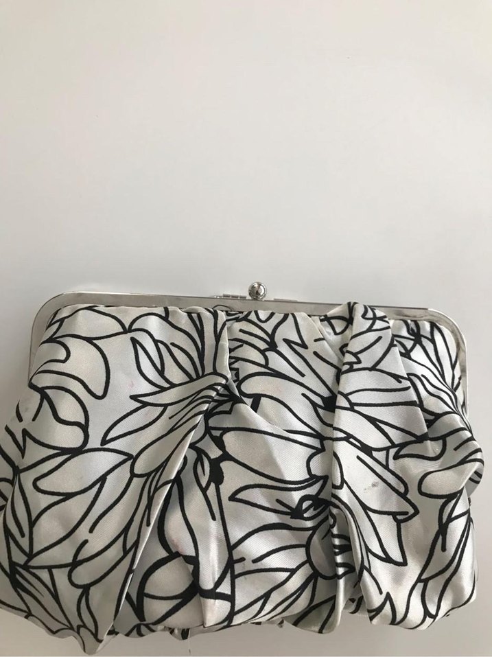 Kadınlar için pilili, baskılı siyah beyaz desene sahip sentetik kumaş clutch çanta. Düğünler için uygun, çağdaş ve modaya uygun Paris tarzı.