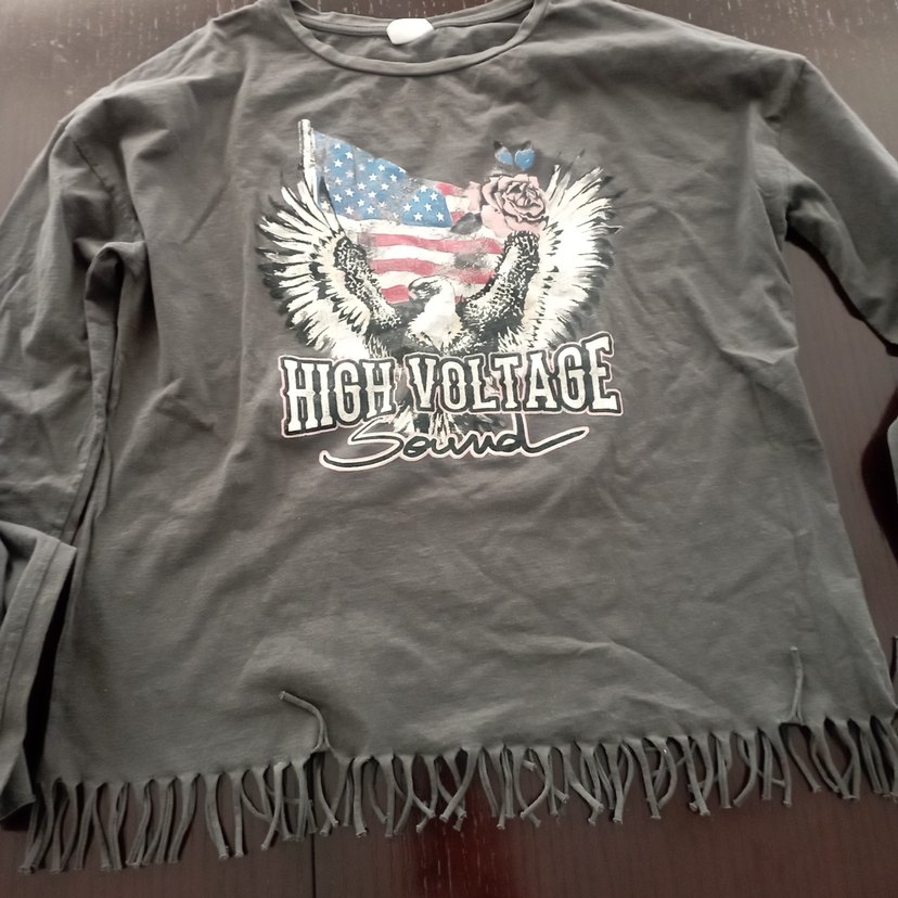 Gri renkte, yüksek yaka ve uzun kollu, bol kesim kız tişörtü. Baskılı desen ve etek kısmında püsküller bulunur. Sentetik kumaştan üretilmiştir. ⚡