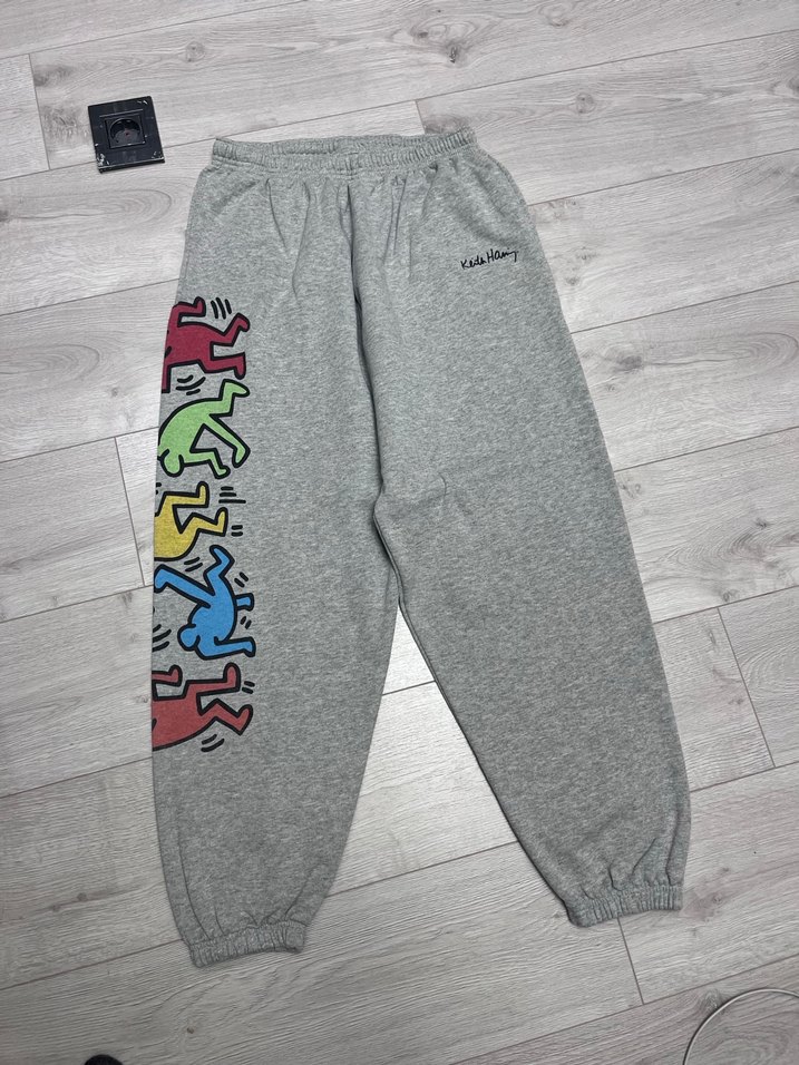rahat kesim, gri eşofman altı. Yanında renkli baskı ve velcro detayı bulunur. Midi boyda, spor ve günlük kullanım için uygundur. ♀️