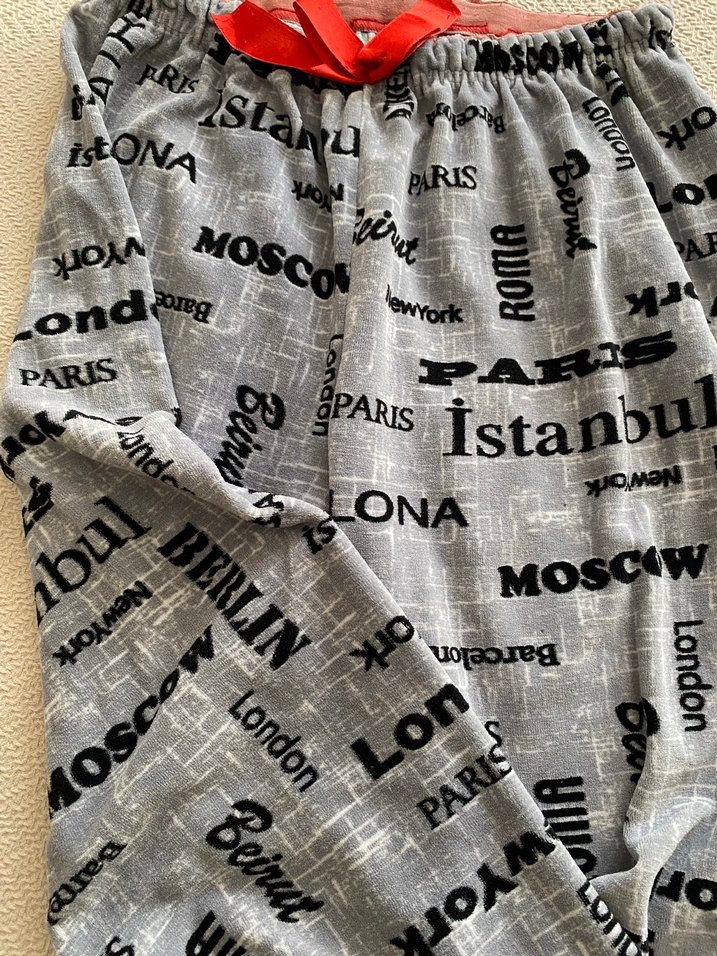 Gri renkli, baskılı şehir isimleriyle süslenmiş, bol kesim ve normal boyda kumaş pantolon. Rahat sokak stili için uygun.