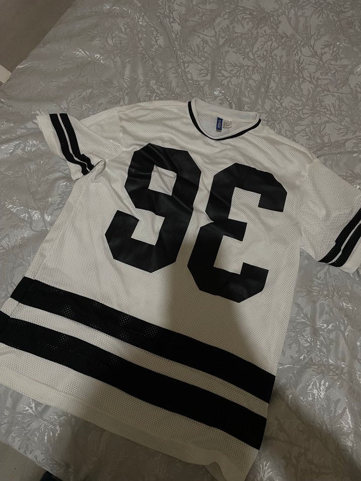 Bu erkek beyaz tişört, rahat kesim, kısa kollu ve yuvarlak yaka özelliklerine sahiptir. Baskılı numara ve siyah şerit detayları bulunur, nefes alabilen sentetik kumaştandır.