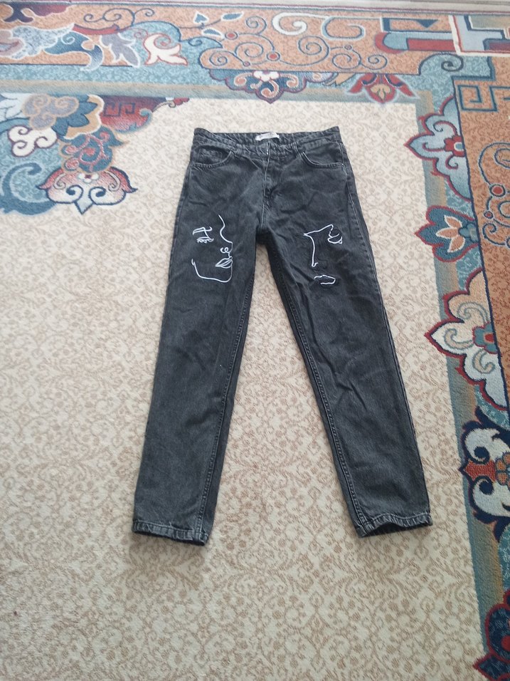 Gri renkte, rahat kesim ve baskılı desenlere sahip kadın jean, günlük kullanıma uygun şık ve rahat bir görünüme sahiptir. boyu 90 cm iki beli 38 cm